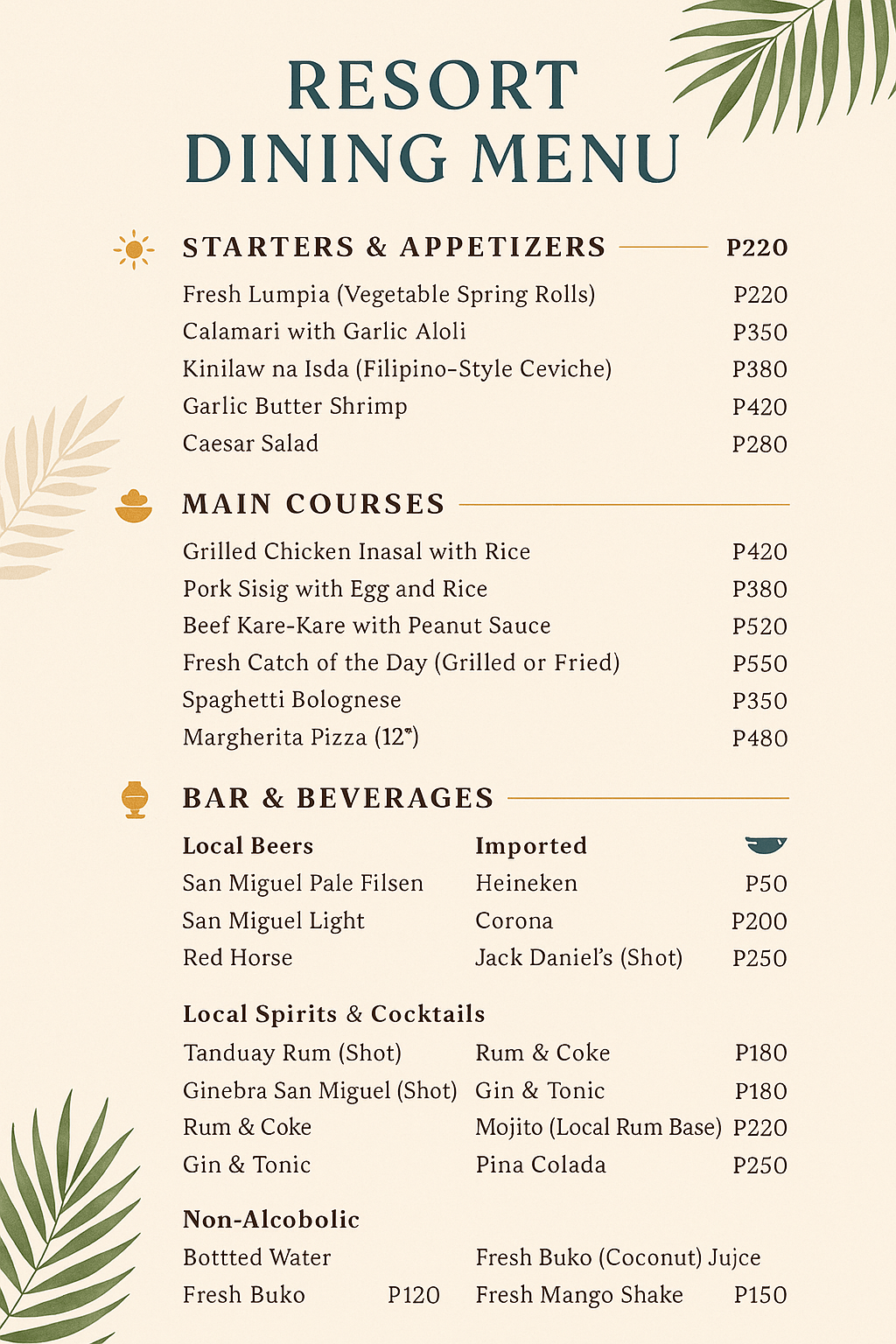 “Begin with breakfast from 7:00 AM to 10:00 AM, then indulge in all-day dining that flows into dinner and cocktails under the stars — the perfect way to end your island day.”